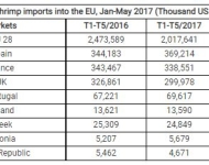 (seafood.vasep.com.vn) As of July 2017, Vietnam’s shrimp exports amounted to US$1.9 billion, up 18.5% over the same period last year. Shipments to top 8 leading markets witnessed the good growth, except for the U.S (-5.5%).
